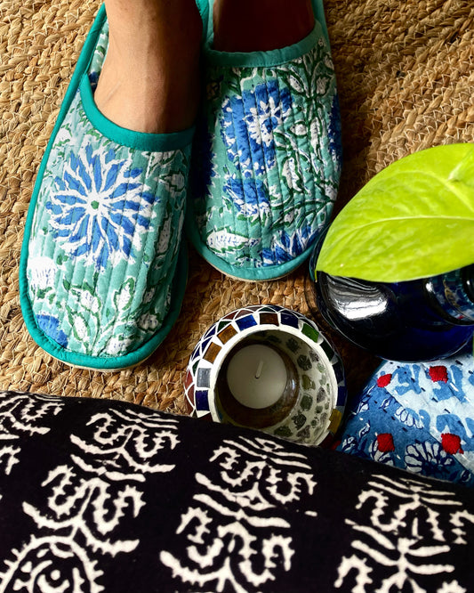 Turquoise Daisy | Hand Block Printed & Quilted Cotton Home Slip-Ons