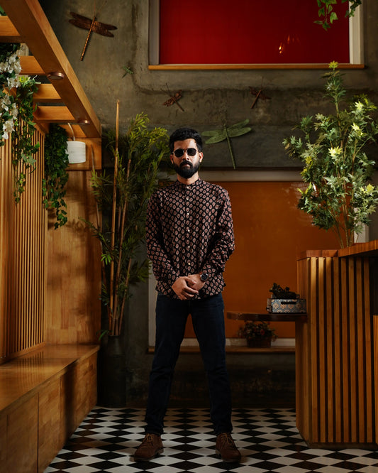 Black & Maroon Leaf Pattern Block-Printed Shirt