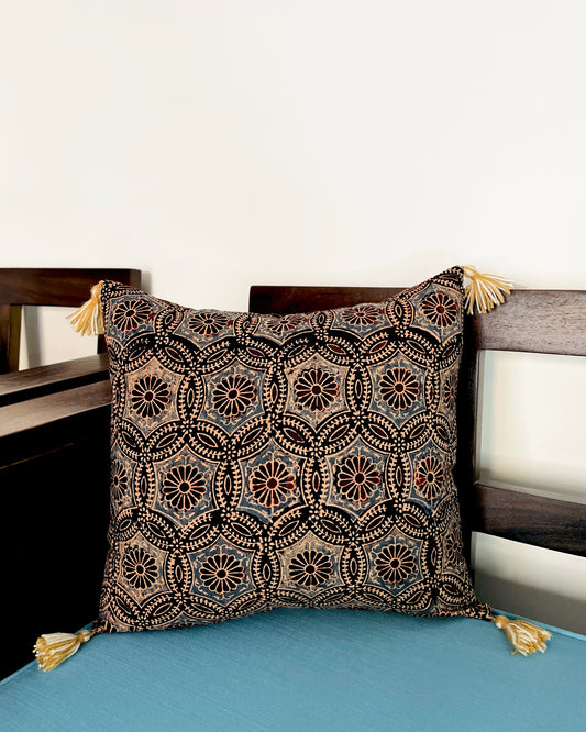 Ikkat Meets Ajrakh | Pure Cotton Block Printed Cushion Covers with multicolor tassles | Set of 2