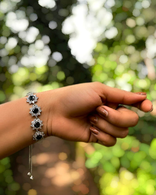 The Black Dahlia | An Exquisite Bracelet with deep black stone set in fine rhodium-plated American Diamonds.