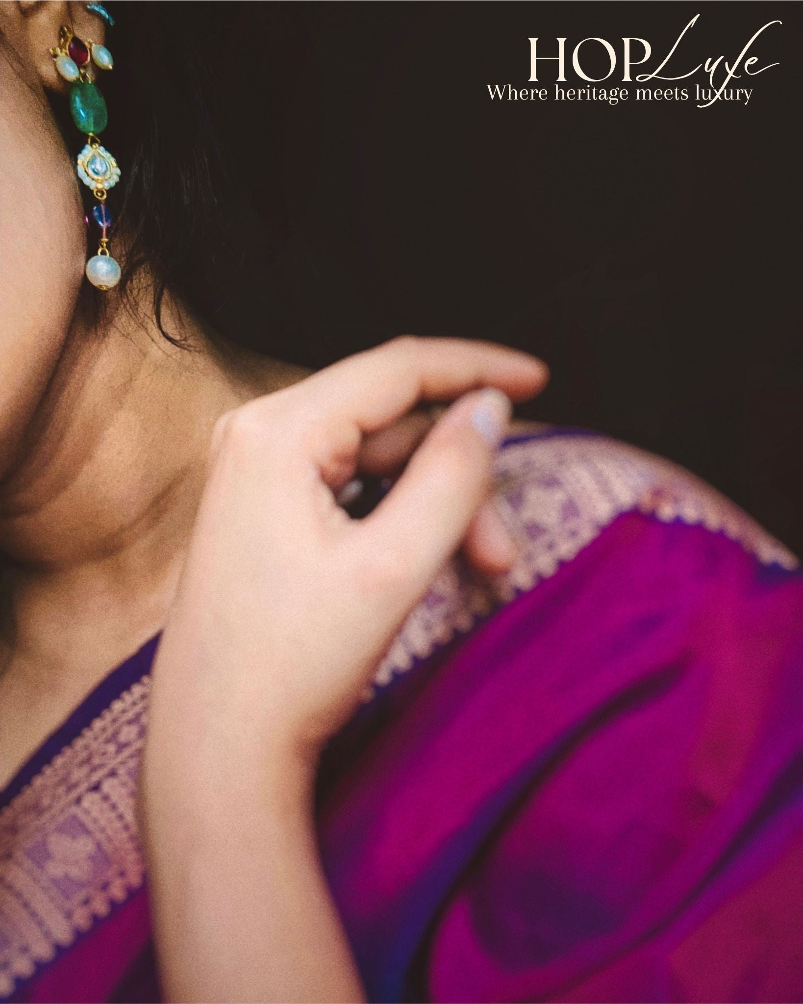 - Handcrafted Kemp and Pachi Kundan work with semi-precious stones.
